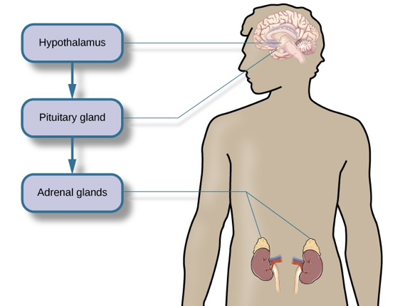 - At the same time, the hypothalamus releases corticotrophin-releasing factor, a hormone that causes the pituitary gland to release adrenocorticotropic hormone (ACTH);