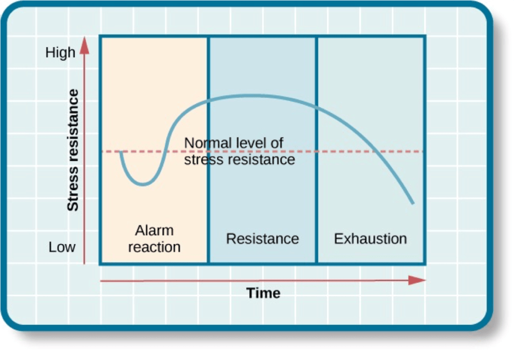 - The exhaustion phase which is where the body’s resistance collapses, leading to infection, tumor growth, aging, irreversible organ damage, or death.